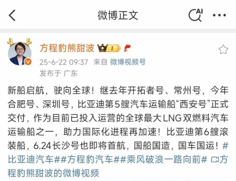 熊甜波发文称,继去年开拓者号、常州号,今年合肥号、深圳号,比亚迪第5艘汽车运输船“西安号”正式交付,作为目前已投入运营的全球最大 LNG 双燃料汽车运输船之一,助力国际化进程再加速。比亚迪第6艘滚装船,6月24日长沙号也即将首航。