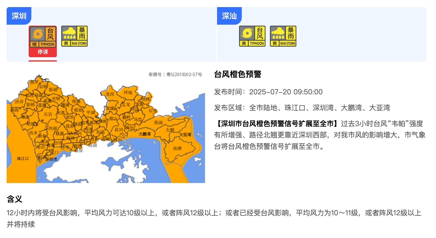 据深圳市气象局消息,今日10时台风“韦帕”中心位于深圳偏南方94公里的海面上,中心最大风力12级(35米/秒)。预计未来6小时将以25公里的速度向西偏北方向移动,趋向珠海,强度还将略有加强。目前深圳台风橙色预警信号已扩展至全市,深汕台风黄色和全市暴雨黄色预警信号生效中。